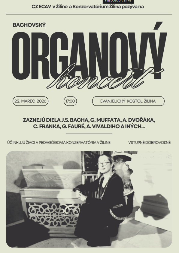 Milovníci klasickej hudby by si mali do kalendára poznačiť nedeľu 22. marca. Evanjelický kostol v Žiline sa o 17:00 hodine stane dejiskom Bachovského organového koncertu, ktorý pripravili žiaci a pedagógovia Konzervatória Žilina v spolupráci s Cirkevným zborom Evanjelickej cirkvi augsburského vyznania.