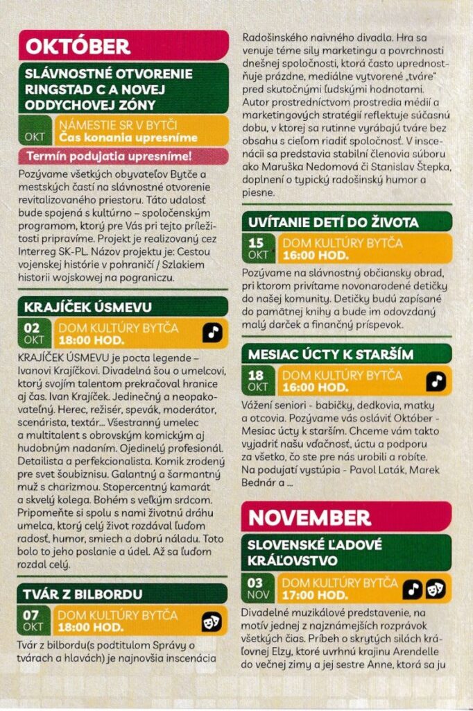 Október prinesie slávnostné otvorenie novej oddychovej zóny na Námestí SR, poctu Ivanovi Krajíčkovi v programe Krajíček úsmevu (2. 10.) aj divadelnú inscenáciu Tvár z bilbordu (7. 10.). Nebude chýbať ani Uvítanie detí do života a Mesiac úcty k starším.