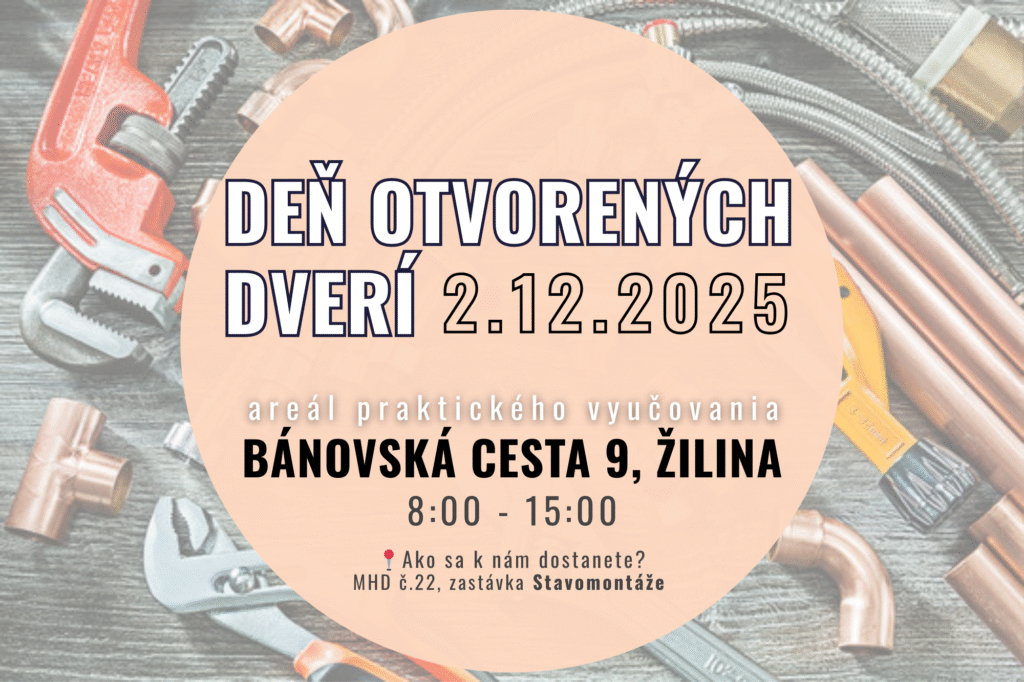 Deň otvorených dverí na SOŠ Stavebnej sa uskutoční v utorok 2. decembra od 8.00 do 15.00 h v areáli praktického vyučovania na Bánovskej ceste 9 v Žiline.