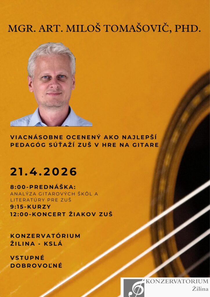 Konzervatórium v Žiline privíta 21. apríla uznávaného gitarového pedagóga Mgr. art. Miloša Tomašoviča, PhD. Stretnutie prinesie nielen odbornú prednášku a kurzy pre učiteľov, ale aj koncert mladých talentov zo základných umeleckých škôl.