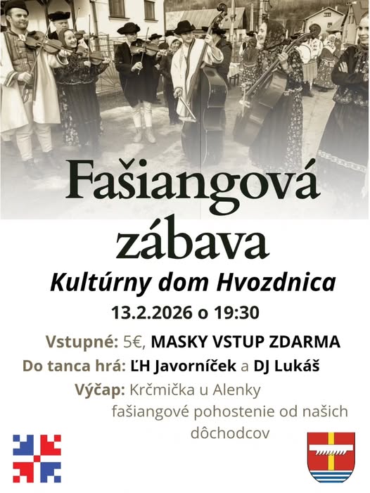 Fašiangová zábava v Kultúrnom dome Hvozdnica sľubuje večer plný hudby, tradícií aj dobrej nálady. O poriadnu tanečnú atmosféru sa postará Ľudová hudba Javorníček, ktorá rozprúdi parket tradičnými tónmi, no chýbať nebude ani modernejšia zábava. Do tanca aj na želanie zahrá DJ Lukáš, takže si na svoje prídu všetky generácie.
