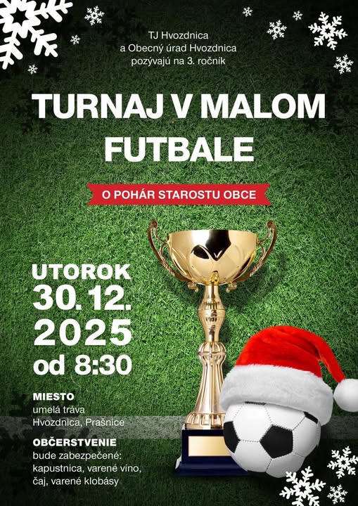 Zima vo Hvozdnici sa tento rok rozbehne vo veľkom štýle! Už 30. decembra od 8:30 hod. sa na umelej tráve v Hvozdnici – Prašniciach uskutoční 3. ročník Turnaja v malom futbale o pohár starostu obce.