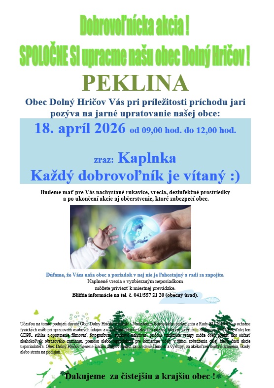 S príchodom jari prichádza aj ideálny čas dať veci do poriadku. A to nielen doma, ale aj v našom okolí. V Dolnom Hričove sa preto rozhodli spojiť sily a pozývajú všetkých obyvateľov na spoločné jarné upratovanie, ktoré sa uskutoční v sobotu 18. apríla 2026.