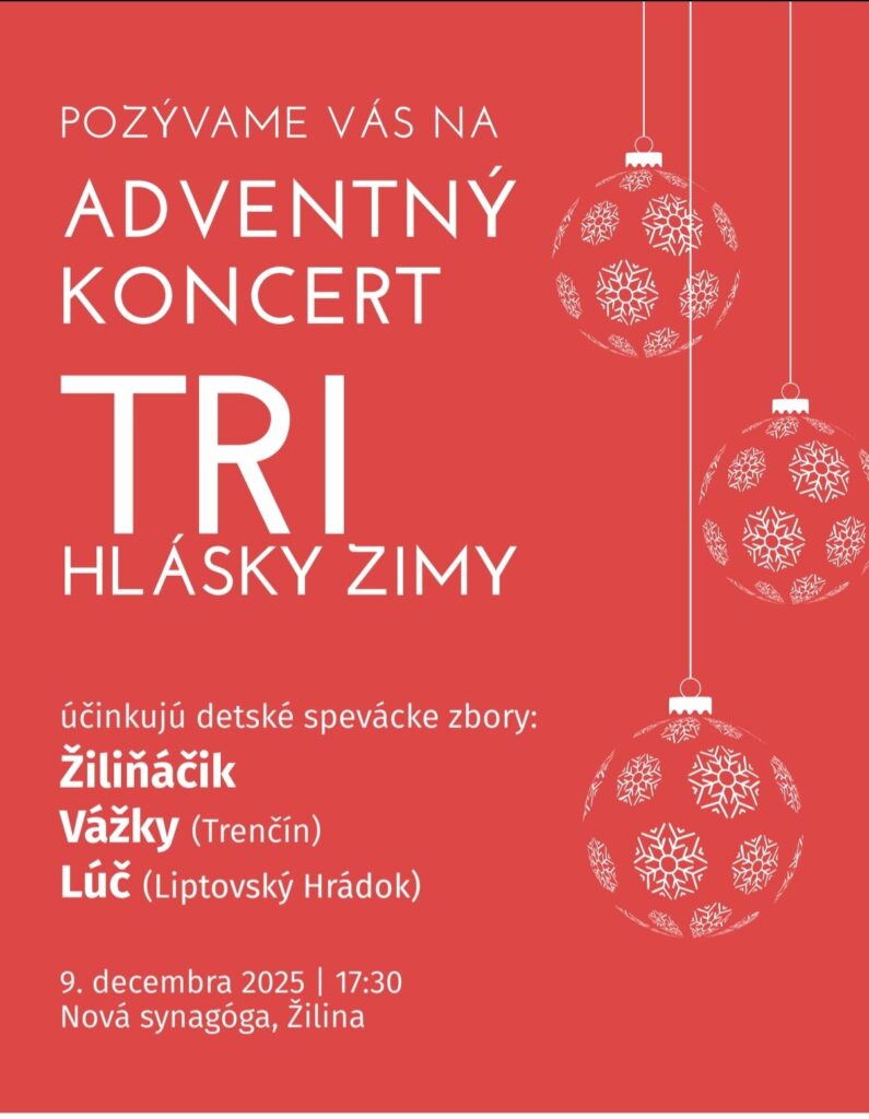Predvianočný čas v Žiline rozvonia melódiami detských hlasov. V utorok 9. decembra o 17:30 sa v Novej synagóge uskutoční koncert „Tri hlásky zimy“, na ktorom sa predstavia tri detské spevácke zbory zo Žiliny, Trenčína a Liptovského Hrádku. Spojené hlasy malých spevákov prinesú do sál harmóniu radosti a priateľstva.