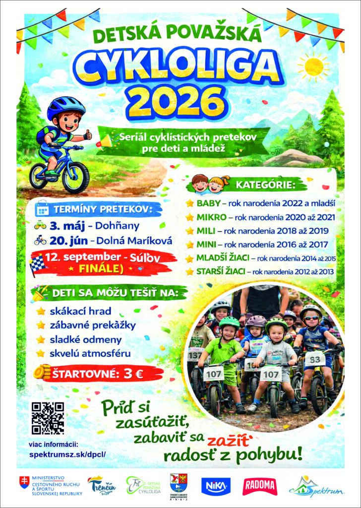Obľúbený seriál cyklistických pretekov pre deti a mládež opäť zavíta do viacerých lokalít regiónu. Prvé preteky odštartujú 3. mája v Dohňanoch, pokračovať budú 20. júna v Dolnej Marikovej v areáli TJ Slovan a veľké finále sa uskutoční 12. septembra v Súľov. Každé z podujatí ponúkne deťom priestor zasúťažiť si, zlepšiť svoje schopnosti a najmä zažiť atmosféru skutočných pretekov.