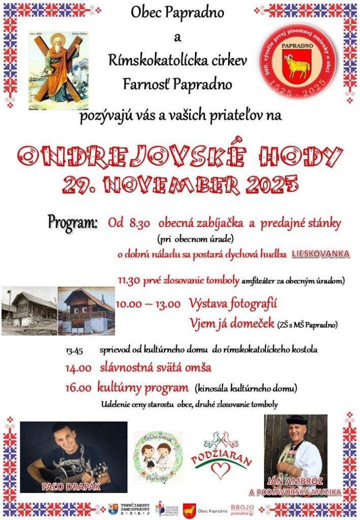 „Sú to spojené farské a obecné hody na počesť sv. Ondreja – patróna nášho kostola. Program začína o 8.30 klasickou Papradňanskou zabíjačkou, kde prasiatko miesto obárania horúcou vodou opaľujeme na slame.