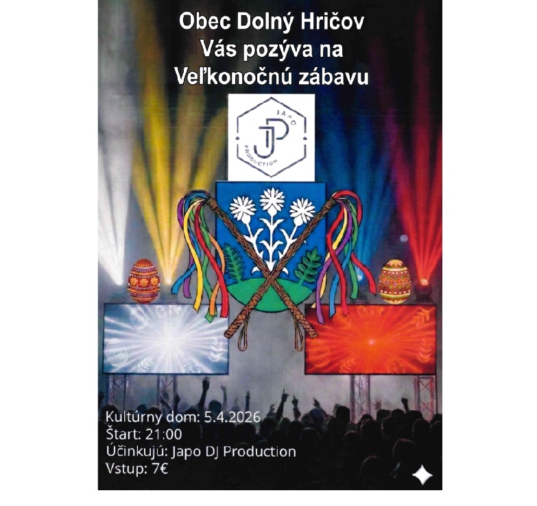 Japo DJ Production v spolupráci s obcou Dolný Hričov pripravil pre obyvateľov obce aj návštevníkov z okolia veľkonočné podujatie, ktoré sľubuje poriadnu dávku energie a zábavy. V nedeľu 5. apríla 2026 sa v miestnom kultúrnom dome uskutoční Veľkonočná zábava, ktorá odštartuje o 21:00 hodine.