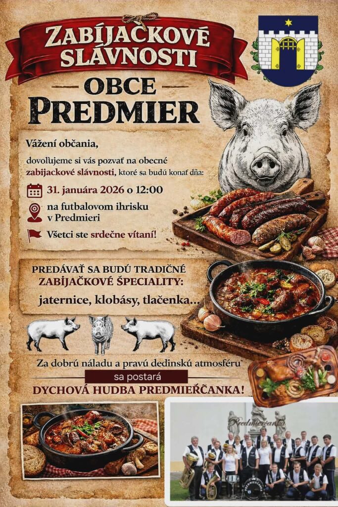 Zima a zabíjačky k sebe jednoducho patria. Obec Predmier pozýva všetkých na obecné zabíjačkové slávnosti, ktoré sa uskutočnia v sobotu 31. januára 2026 od 12.00 hodiny na futbalovom ihrisku v Predmieri.