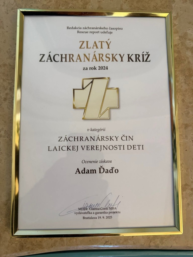 Len dvanásťročný Adam Ďaďo z Gymnázia získal jedno z najprestížnejších ocenení na Slovensku – Zlatý záchranársky kríž. Počas leta zachránil život štvorročnému chlapcovi, ktorý sa topil v aquaparku.